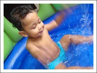the neighbour gave us an air-filled mini-pool. As soon as he sees it, u can see his eyes twinkling with glee and cannot wait to jump into it!.. ahahhaa... and when we did put him in it, alahai... time tido pun lupa!!.... he dun wanna get out of it!.. we had to drag him out!!